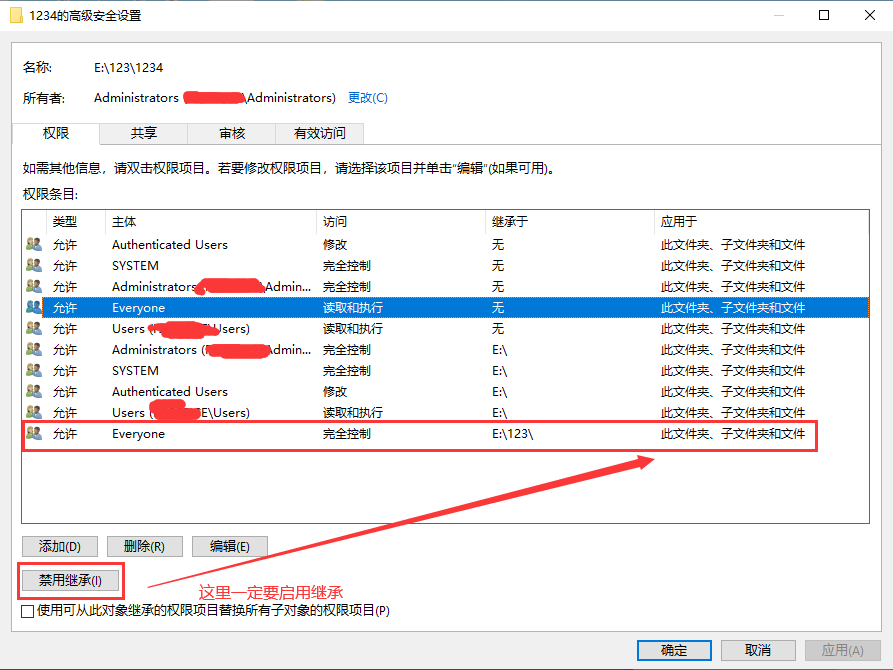 第二步:启用继承-此文件夹、子文件夹和文件(相当于目录下所有文件夹和文件都有继承)