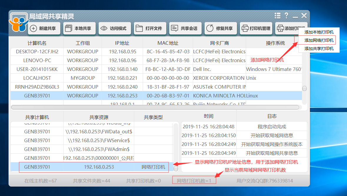 第一步:使用”局域网共享精灵”搜索局域网内的网络打印机,如果您知道网络打印机IP地址可跳过此步骤。