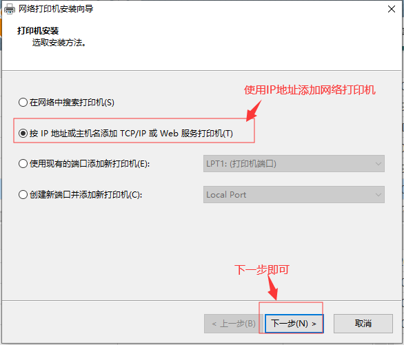 使用默认的IP地址添加,如果您不知道可以选择"在网络中搜索打印机"即可( 这里我们使用IP地址添加)