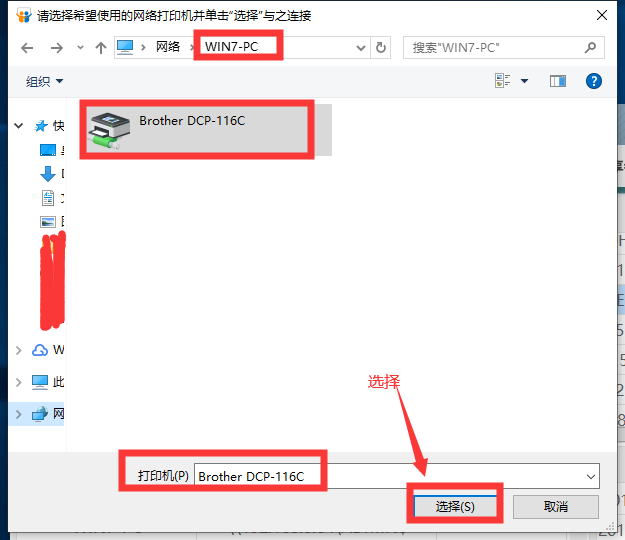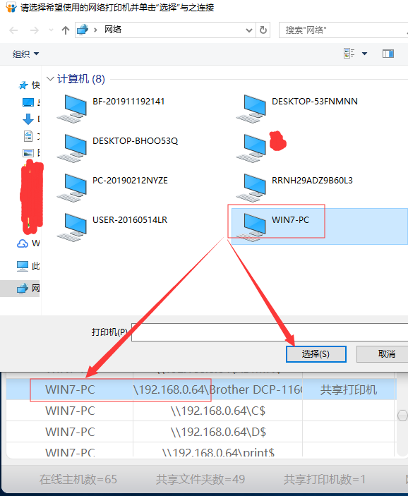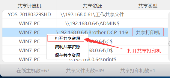 选择网络列表中的WIN7-PC的计算机完成添加。 也可以使用共享资源列表中的打开共享资源功能来连接共享打印机