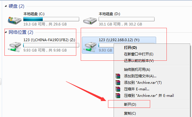- 第三步:打开"我的电脑"显示映射的网络驱动器,也可以点击"断开"来断开一个网络驱动器